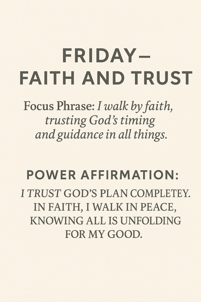 I trust God’s plan completely. In faith, I walk in peace, knowing all is unfolding for my good.