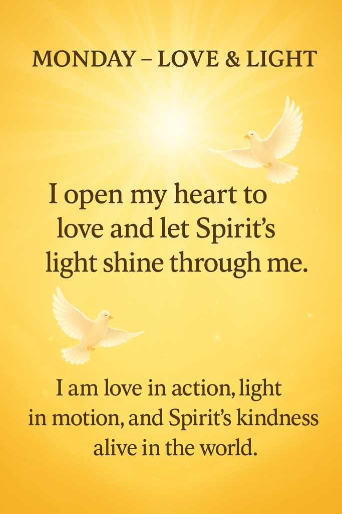 This week, I choose to shine light in dark spaces, beginning with myself. As I grow, I remind myself that I am already enough—love in action, light in motion. Simply by being true to Spirit within, I lift others and reflect God’s kindness in the world.
